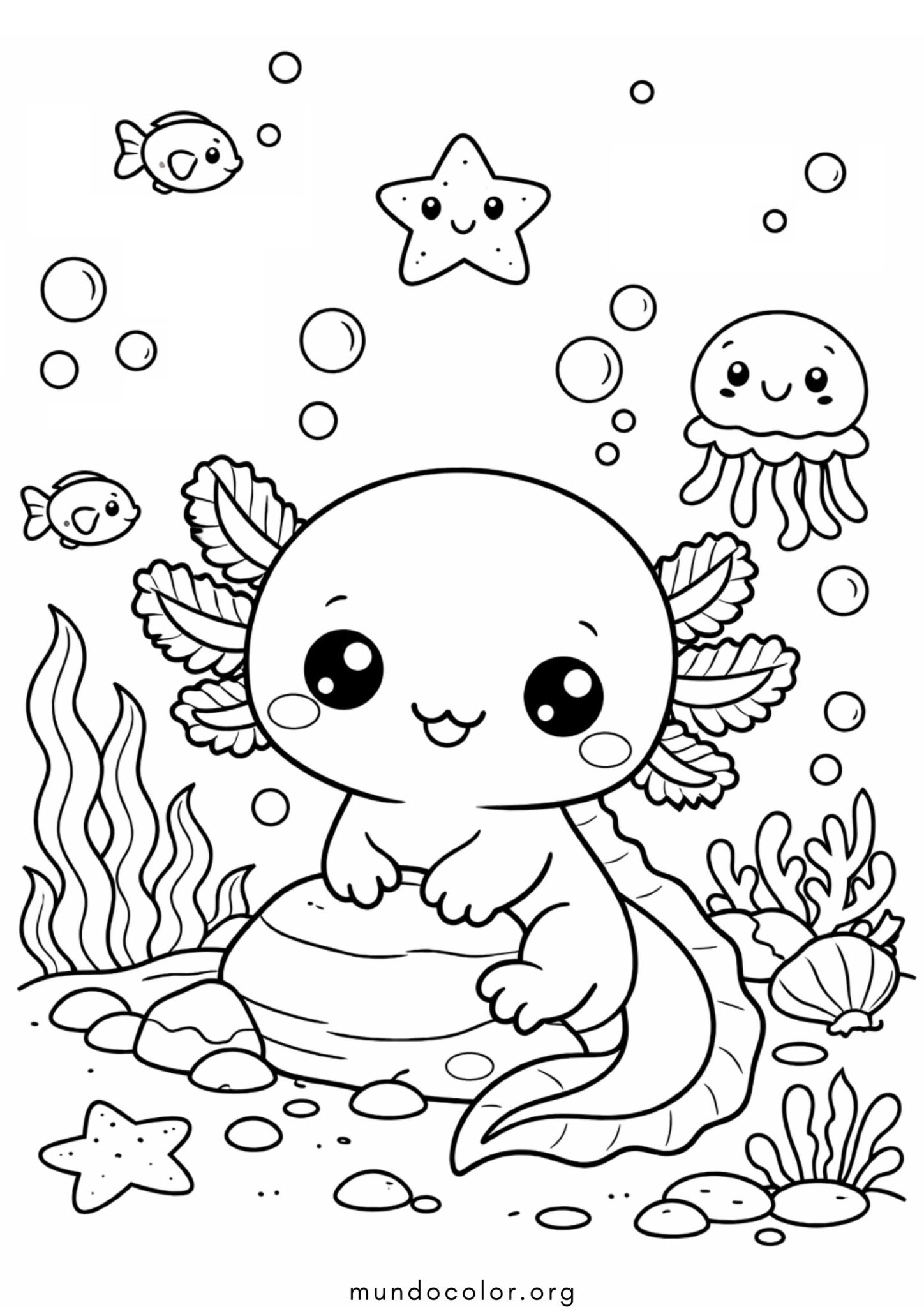 Sumérgete en una aventura bajo el agua con esta adorable rascarca de Ajolotes kawaii que captura toda la magia del océano en un solo dibujo 🌊. En la imagen vemos a un pequeño ajolote con ojos enormes y brillantes descansando sobre una piedra, rodeado de burbujas juguetonas, estrellas de mar sonrientes, medusas amigables y coloridos arrecifes de coral. El diseño cuenta con formas redondeadas y elementos grandes y despejados en el personaje principal, combinados con detalles medianos en la vegetación marina y los animalitos del fondo, lo que hace que esta lámina de ajolote para colorear sea perfecta para niños de entre 4 y 9 años que aman los personajes tiernos ✍️. Es un dibujo de ajolote estilo kawaii para pintar que invita a la relajación y permite a los pequeños artistas usar toda su imaginación para crear un acuario lleno de vida.